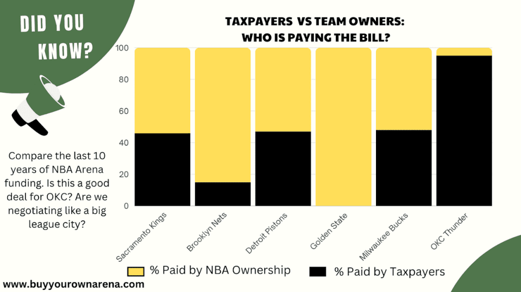 Let’s talk about the owners for a second. On average, an NBA owner pays 74% of the purchase price of a new arena. But the Thunder owners are different. The owners, with a total worth of over $1B, decided that they would only kick in $50M for a $900M arena. The other $850 would be left to taxpayers. I guess we are just supposed to forget how the Thunder owners lied to locals in 2023 when they said they would make a “significant financial contribution” to any new arena?