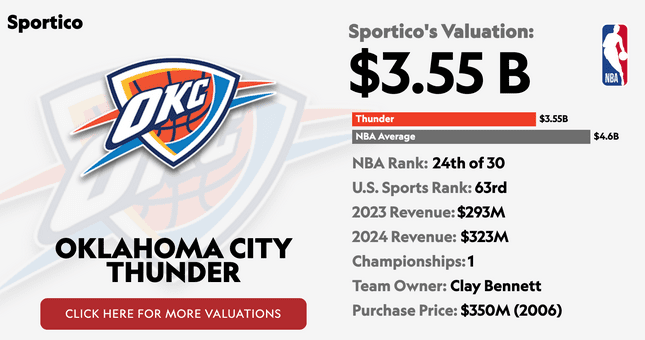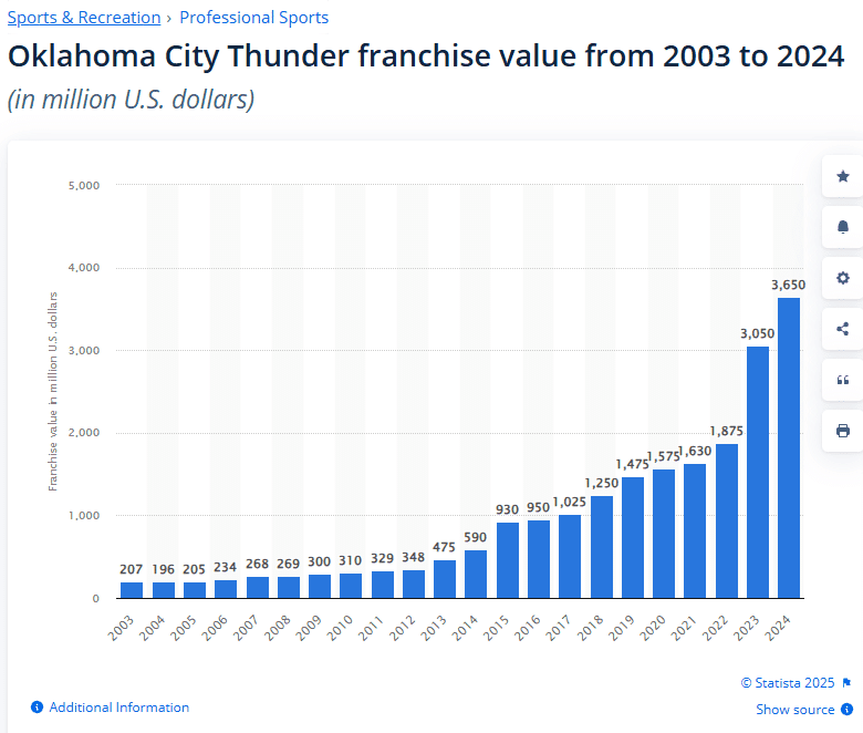 In the NBA, the value of teams is rising at a rather insane pace. In 2006, the current owners of the Thunder bought the team for $350M. Now, the value of the team hovers around $3.5B.