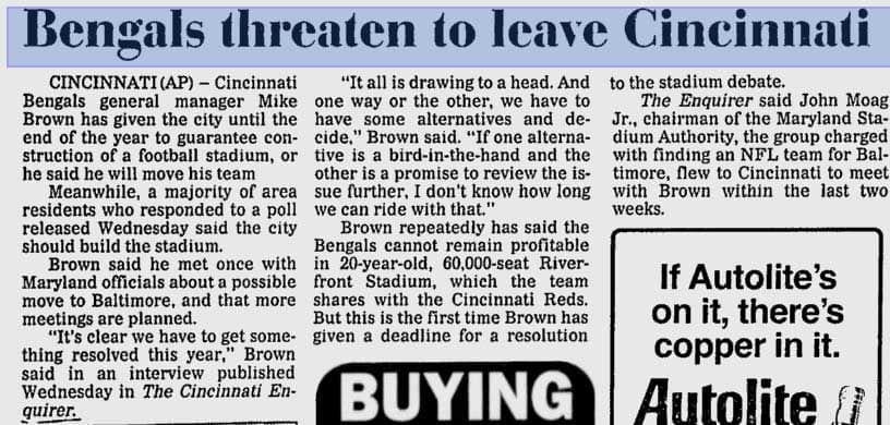 The Cincinnati Bengals are known to be run by one of the cheapest owners in the NFL, Mike Brown. In 1996, local leaders were not prepared to competently negotiate against the team of lawyers brought in by the Bengals.