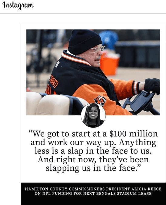 Thankfully, it appears that Hamilton County has people in power with the right idea heading into negotiations with the Bengals. The President of the Hamilton County Board of Commissioners reminded everyone that “there will be no new taxes with any renovations” and that the funding source for any new or upgraded stadium was voted on by taxpayers and that is all the money available to give to the team.