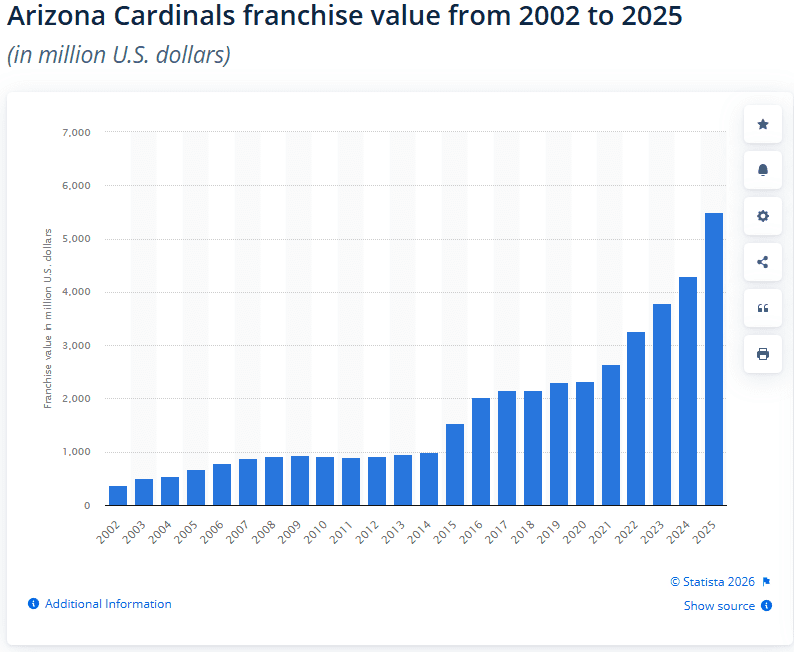 — StatistaThe Bidwill family are what I call a Rake Family. They love stepping on rakes and then seem surprised when it comes back and hits them in the face. The Bidwill’s first few years in Arizona are a perfect example of this. When the Bidwill family moved the Cardinals from St. Louis to Arizona in 1987, they did so because St. Louis wouldn’t build them a brand-new stadium. Cardinals executives claimed that people in Arizona would. Therefore, the team moved to Arizona, and nothing was built. The stadium builders never came through, and the team was stuck for the next 18 years using Sun Devil Stadium, where Arizona State University played (and still does play) football games. Why?