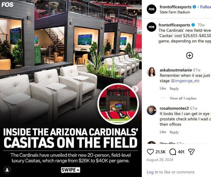 — Arizona Cardinals Fan Group on FacebookFor example, one specific part of the stadium that was never full during this entire season was a rebuilt section of the stadium called the “Casa Roja Club,” which sits at midfield and is behind the opposing team’s bench. It was built just last year and offered luxury options with ticket prices starting at $1,000 per game. What about the fans who sat in these seats in previous years? They “were forced to either relocate or pay significant price hikes.” Fans have gone to social media to vent their anger, and rightfully so. The team has been raising prices at least 10% yearly (yes, some seats may be a few more or less depending on where you sit).
